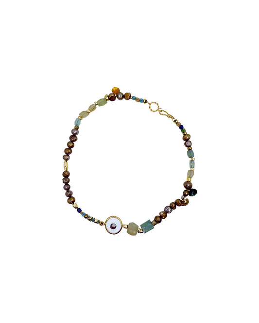 ARTIZ | 'Spring Collection Necklace – Short (6)’ | Freshwater pearls / antique Roman glass / bronze charm