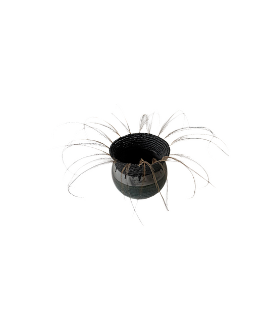 MONIQUE BURKHEAD | ‘Clay + Weave (1)’ | Raku glazed + fired ceramic / Raffia weaving / Emu + cassowary feathers