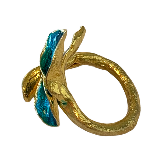ARTIZ | 'Teal Enamel Leaf Ring ' | Gold plated bronze