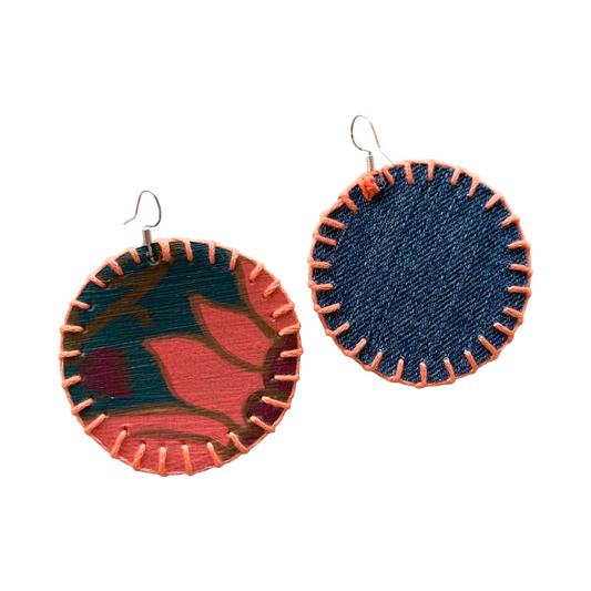 MUM’A NAI | ‘Maxi Attraction – Tropics #1’’ | Upcycled denim / acrylic on black leather with sparkle copper embroidery / sterling silver hooks | 8 (d) cm