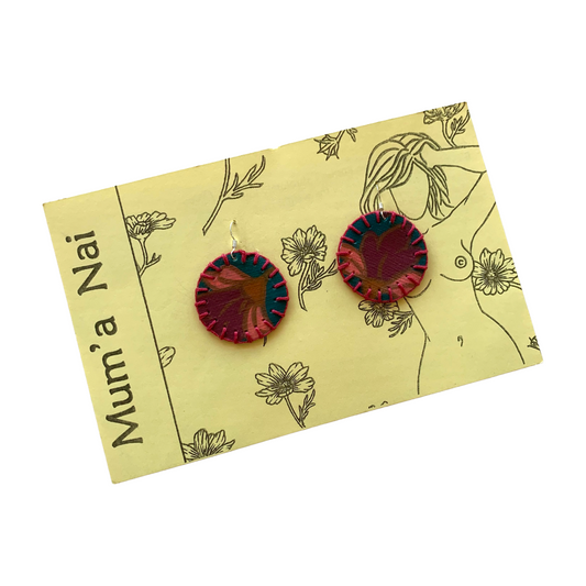MUM’A NAI | | ‘Mini Fun – Maze of Life #2’ | Upcycled blue cotton material / acrylic on canvas / peach cotton embroidery / sterling silver hooks | 3.5 (d) cm