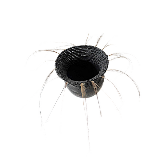 MONIQUE BURKHEAD | ‘Clay + Weave (2)’ | Raku glazed + fired ceramic / Raffia weaving / Emu + cassowary feathers