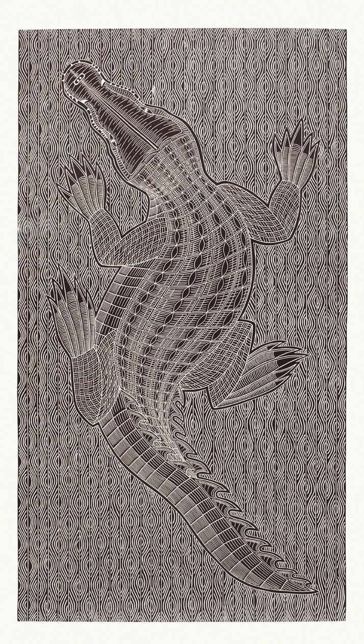 Ayupulumay means hunting or looking for food. During Sageraw Thonar we still have to go out hunting even though the weather on the water may not be good. I feature the totems of my family within my artwork. This work features the crocodile, which is the totem of both my mother and father. In each of the legs there are three bars carved. This mark represents my three kids. The pattern in the background of the print symbolizes the incoming and outgoing tide. When the tide is outgoing the water is calm – we call this Kulis.