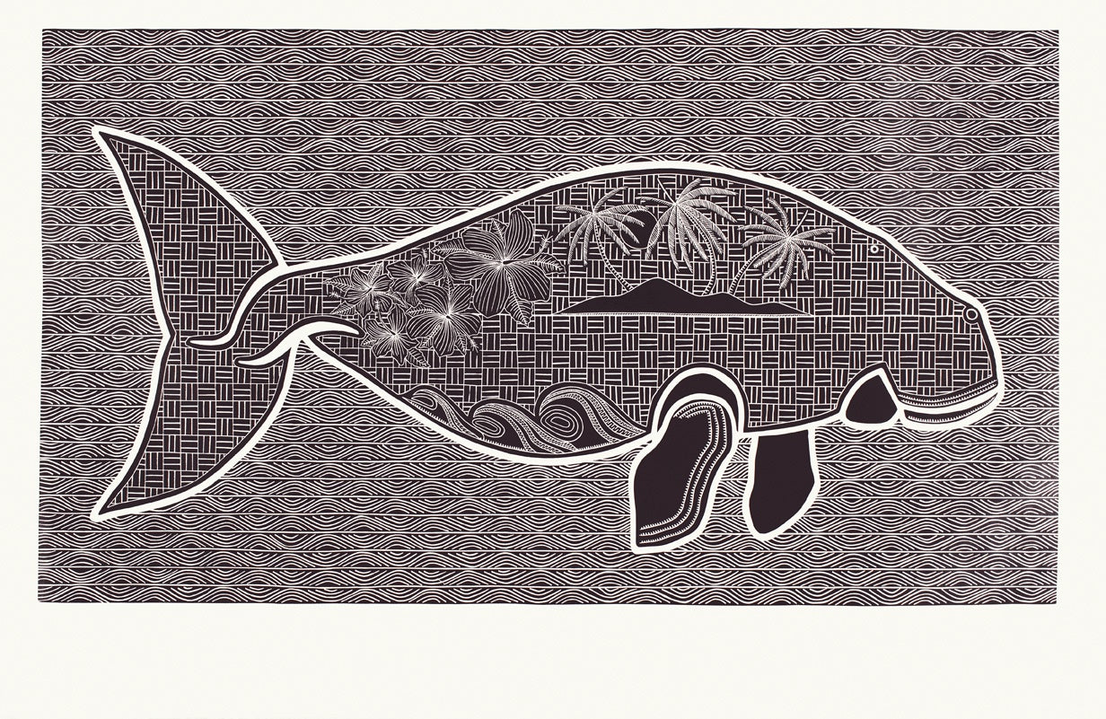 "Dhangal means dugong. The dugong is another totem of my family on my mothers’ side. Inside the dugong I represent members of my family. The three coconut palms represent my father and his two brothers. Coconuts play an important role in marking land boundaries on the island. The five hibiscus flowers represent my mother and her four sisters. My mother was an avid gardener and always came back with hibiscus cuttings from around the island. The belly of the dugong has the rough winds of Sageraw Thonar blowing the waves and tides. The three bars represent my three children."