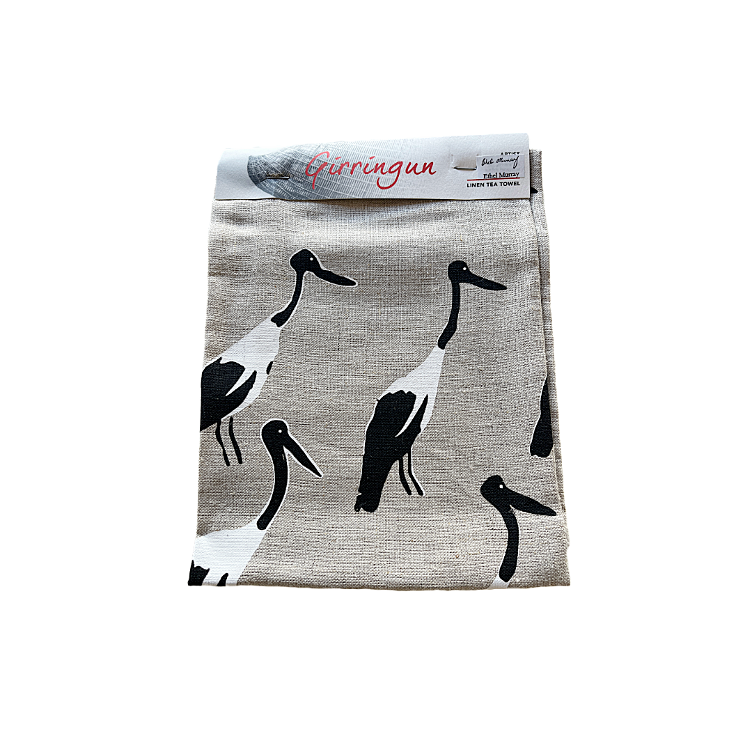 100% linen tea towel featuring a screen printed artwork 'Jabiru' by contemporary artist Ethel Murray.
