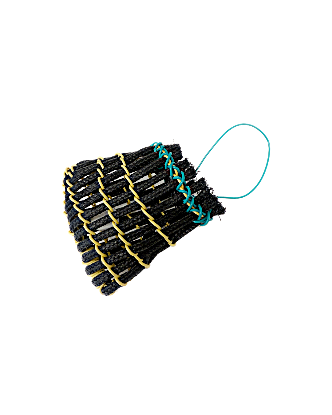 GIRRINGUN ART CENTRE – Nephi Denham | ‘Mindi’ basket | Electrical wire yellow / teal and black rope | 12 (h) x 11.5 (w) x 7 (dia) cm