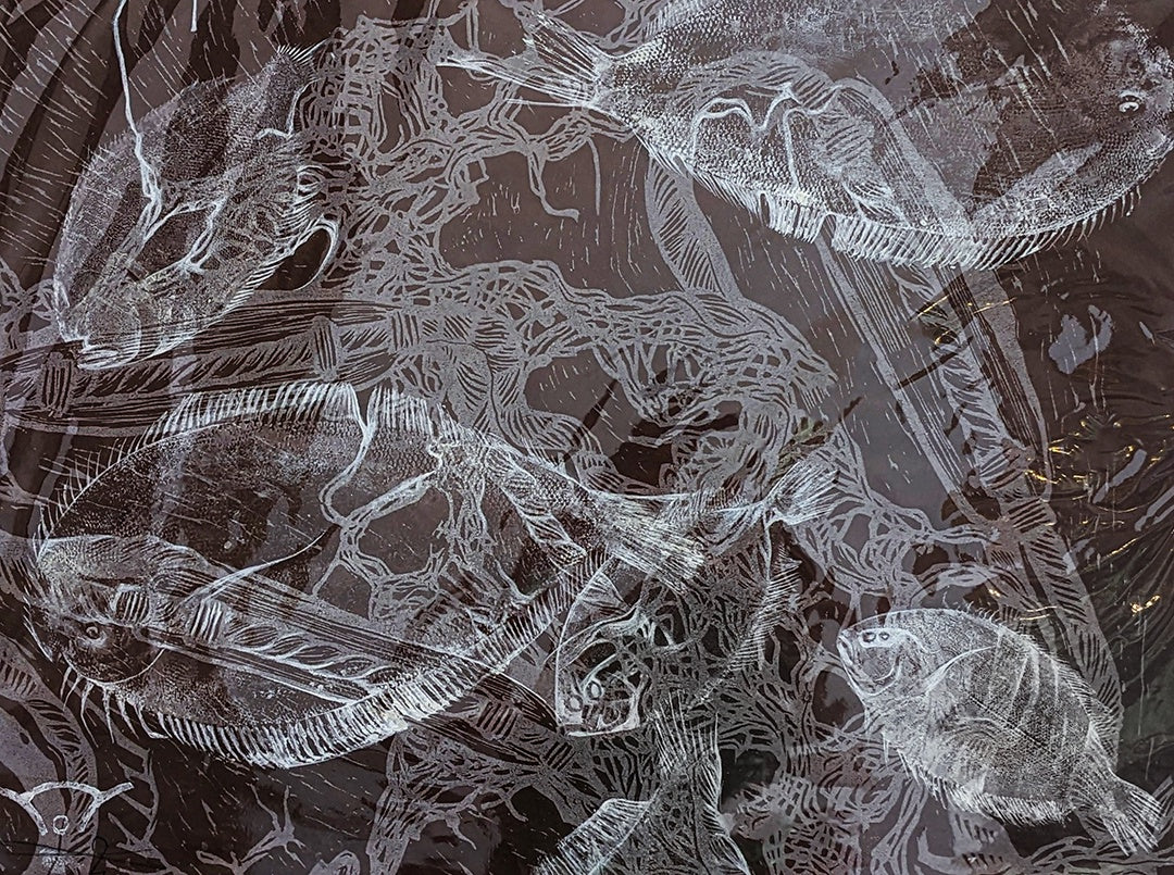 This technique creates an image using fresh fish as the master plate. Originally designed by Japanese Fishermen to record their fish species, they would take paper and ink out in their boat and would 'rub' an impression by painting over the whole fish body. While several images may be taken from each fish no two images remain the same.