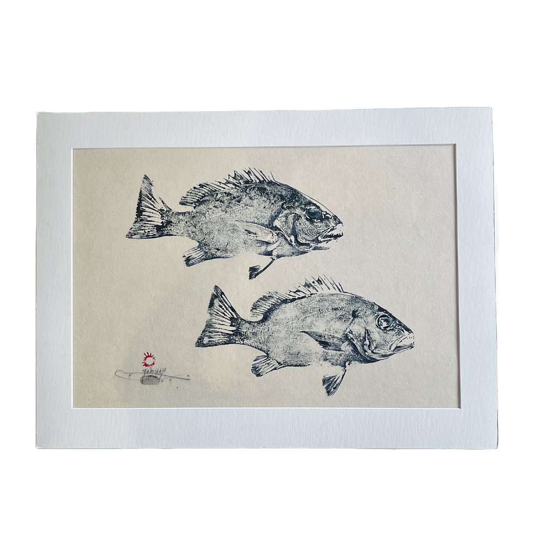 This technique creates an image using fresh fish as the master plate. Originally designed by Japanese Fishermen to record their fish species, they would take paper and ink out in their boat and would 'rub' an impression by painting over the whole fish body. While several images may be taken from each fish no two images remain the same.