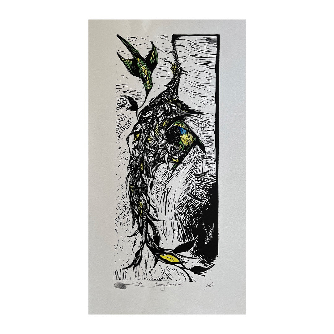 JANE DENNIS | ‘Sunbird Balcony’ | Hand-coloured linocut
