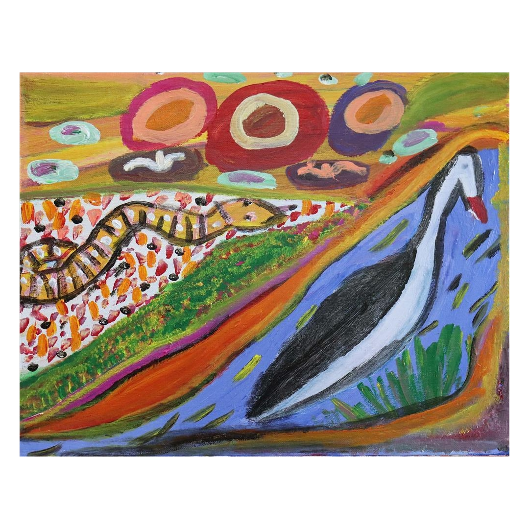 I only came back in 2008 so that I could be with my family and live back on Bentinck Island. When old May died the other Bentinck artists asked me to come and join their group and paint at the Art Centre. I had done a little bit of painting in Darwin on small canvas boards more for fun than anything else. I really liked to go to the Art Centre and paint with old Aunty Sally and my other sisters. We had so much fun. Now I go every day to paint my stories and keep my memories alive. I paint Thundi where I was born and Makarrki where my father was born. It makes me feel good and proud when I see the finished painting.