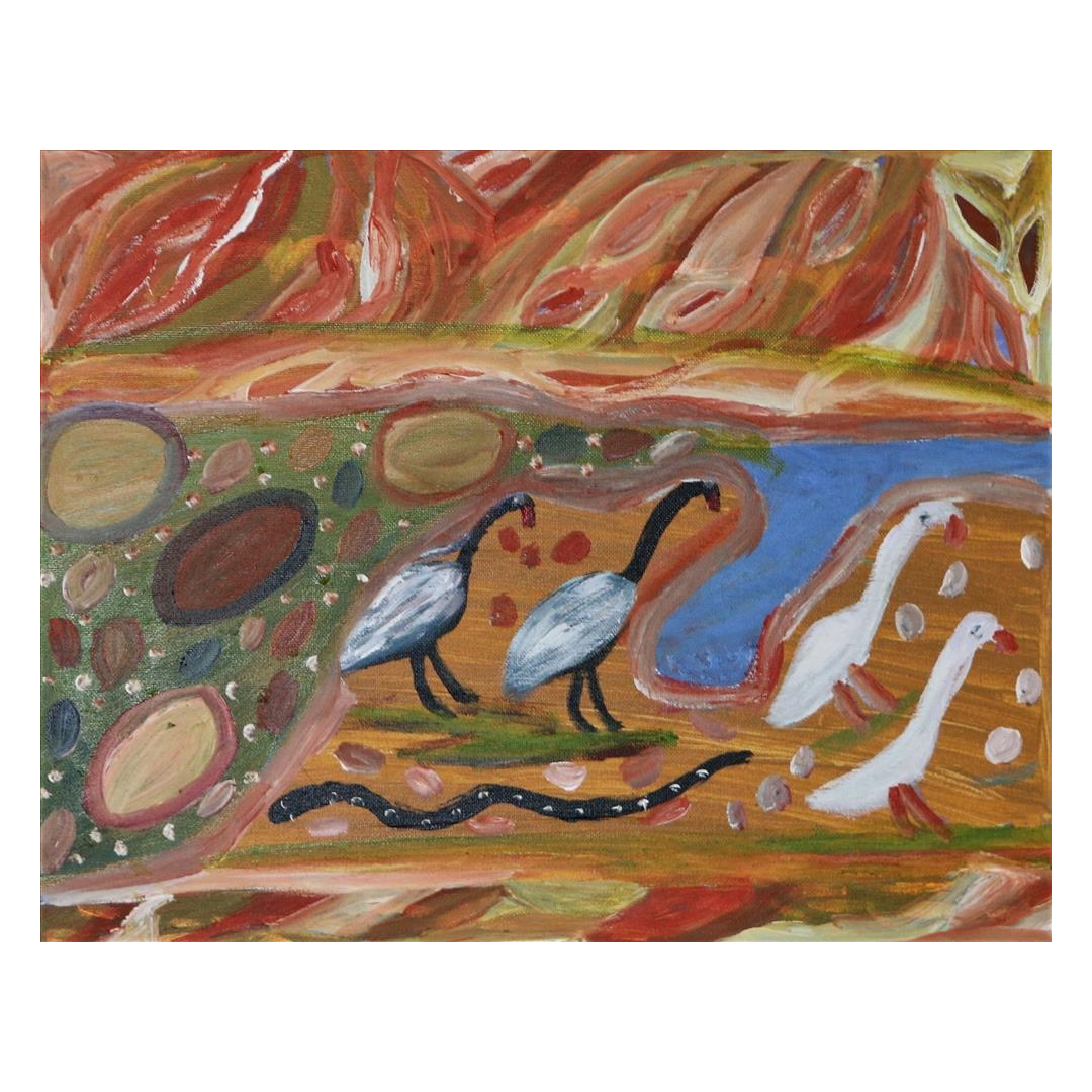 I only came back in 2008 so that I could be with my family and live back on Bentinck Island. When old May died the other Bentinck artists asked me to come and join their group and paint at the Art Centre. I had done a little bit of painting in Darwin on small canvas boards more for fun than anything else. I really liked to go to the Art Centre and paint with old Aunty Sally and my other sisters. We had so much fun. Now I go every day to paint my stories and keep my memories alive. I paint Thundi where I was born and Makarrki where my father was born. It makes me feel good and proud when I see the finished painting.