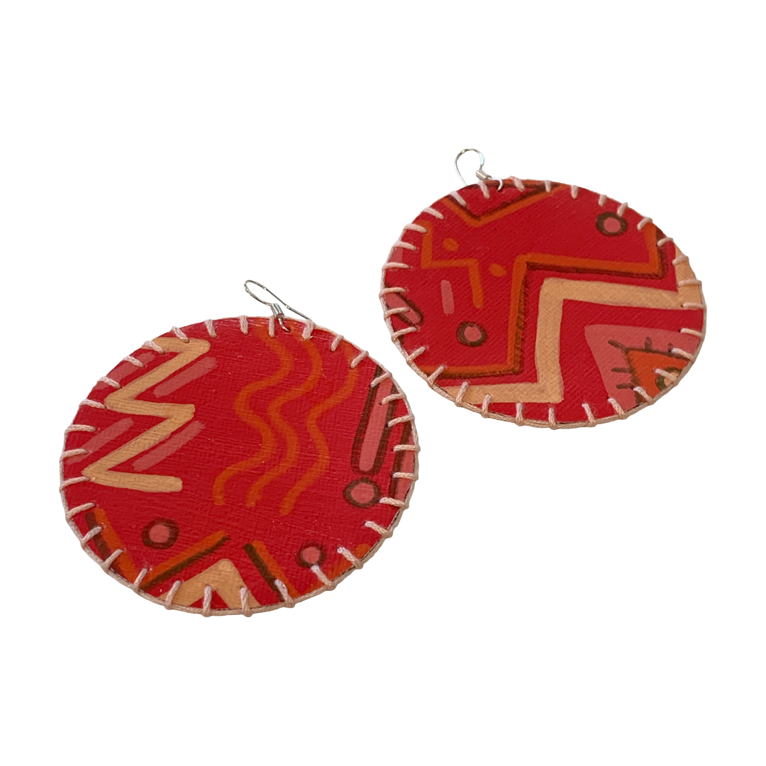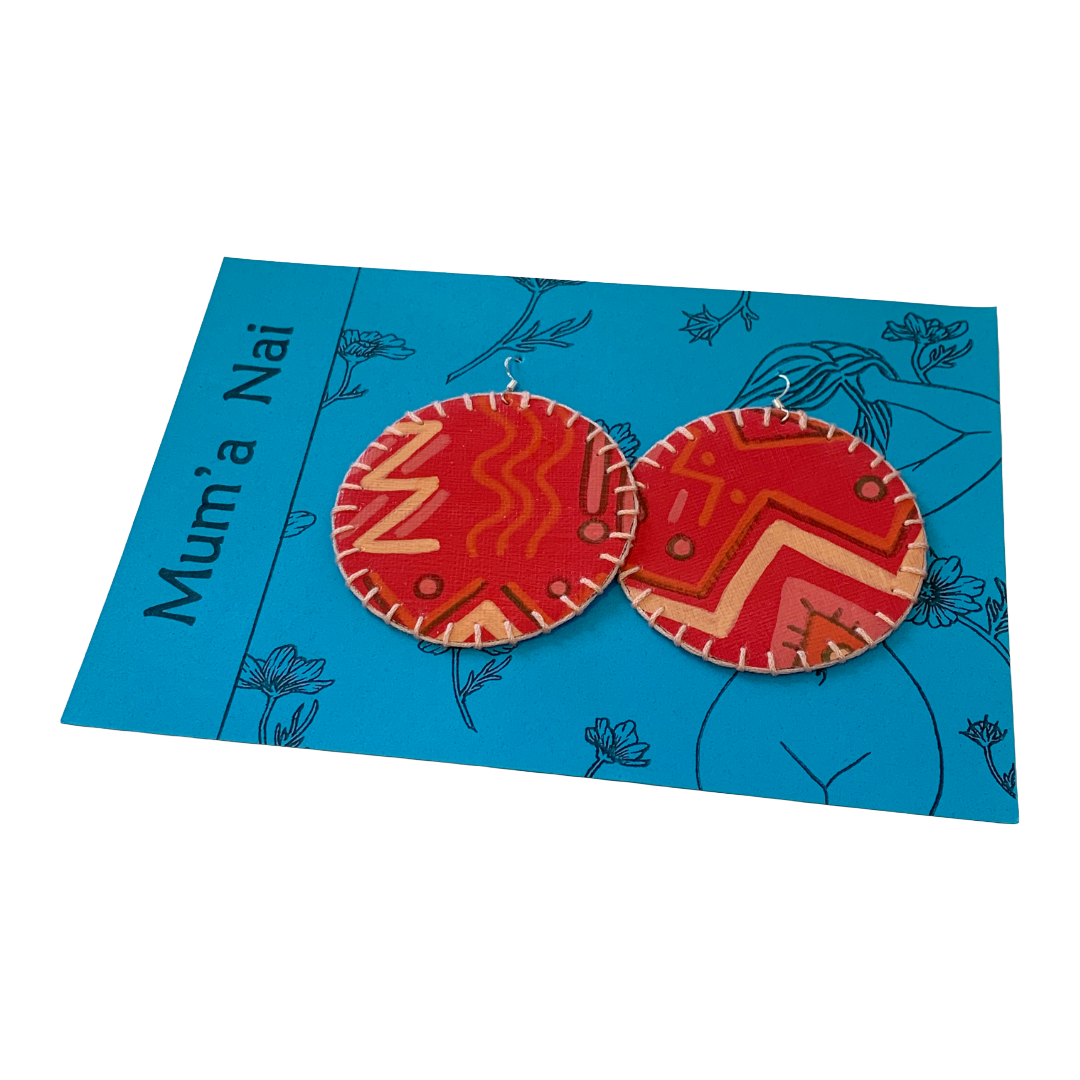 "Anyone that knows me, knows I absolutely love BIG earrings! Just not a fan of the weight that comes with it a lot of the time… So, I created a line of earrings, mixing and matching off cuts of leather, screen printed material and hessian, acrylic and coffee on canvas, merged with embroidery to create light weight wearable art! These are all handmade, using a very sustainable arts practice with at least 80% of resources up-cycled. Enjoy your sustainable bling… and have a beautiful day. Much love, Mum’a Nai" Mum’a Nai is an emerging artist born in Cairns, with a love for textile art. Her work focuses on having an earth friendly sustainable practice, repurposing used, damaged and discarded items, exploring the notion of beauty and function. Her style is a cross over between traditional and contemporary craft and conceptual art. Influenced by her parents and grandparents who were all creative in a variety of ways and instilled a deep-seated value around repurposing.