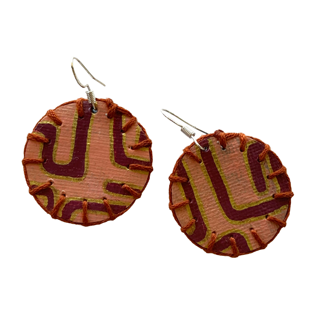 "Anyone that knows me, knows I absolutely love BIG earrings! Just not a fan of the weight that comes with it a lot of the time… So, I created a line of earrings, mixing and matching off cuts of leather, screen printed material and hessian, acrylic and coffee on canvas, merged with embroidery to create light weight wearable art! These are all handmade, using a very sustainable arts practice with at least 80% of resources up-cycled. Enjoy your sustainable bling… and have a beautiful day. Much love, Mum’a Nai" Mum’a Nai is an emerging artist born in Cairns, with a love for textile art. Her work focuses on having an earth friendly sustainable practice, repurposing used, damaged and discarded items, exploring the notion of beauty and function. Her style is a cross over between traditional and contemporary craft and conceptual art. Influenced by her parents and grandparents who were all creative in a variety of ways and instilled a deep-seated value around repurposing.