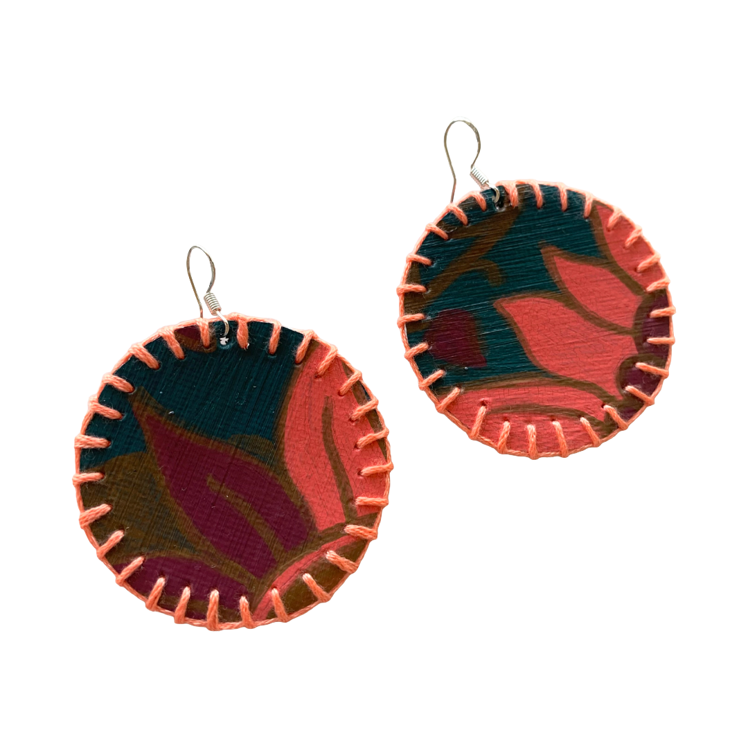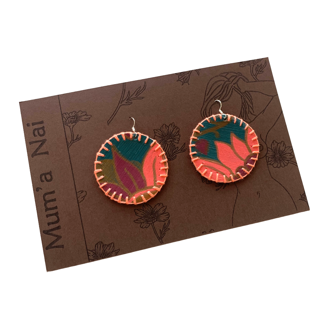 "Anyone that knows me, knows I absolutely love BIG earrings! Just not a fan of the weight that comes with it a lot of the time… So, I created a line of earrings, mixing and matching off cuts of leather, screen printed material and hessian, acrylic and coffee on canvas, merged with embroidery to create light weight wearable art! These are all handmade, using a very sustainable arts practice with at least 80% of resources up-cycled. Enjoy your sustainable bling… and have a beautiful day. Much love, Mum’a Nai" Mum’a Nai is an emerging artist born in Cairns, with a love for textile art. Her work focuses on having an earth friendly sustainable practice, repurposing used, damaged and discarded items, exploring the notion of beauty and function. Her style is a cross over between traditional and contemporary craft and conceptual art. Influenced by her parents and grandparents who were all creative in a variety of ways and instilled a deep-seated value around repurposing.
