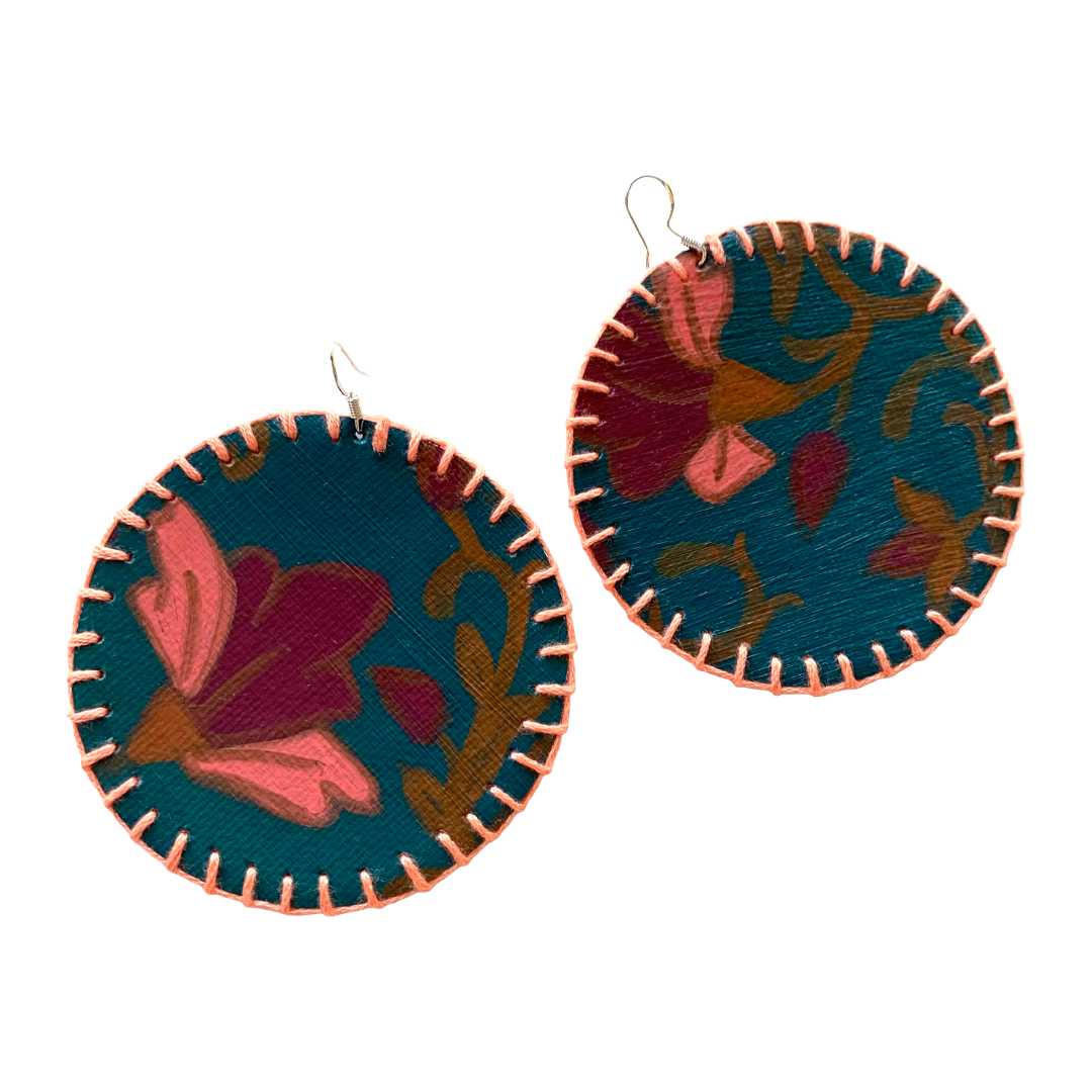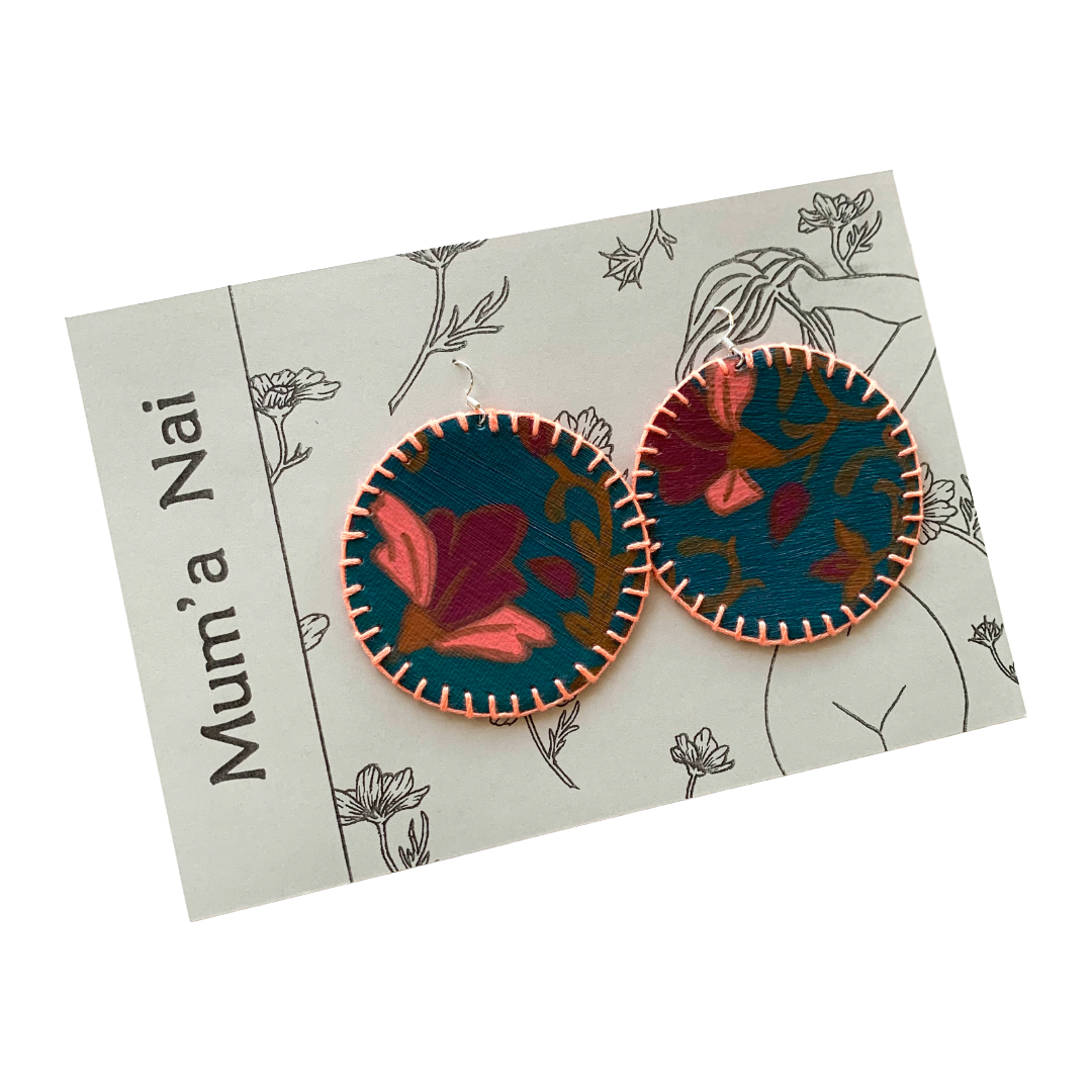 "Anyone that knows me, knows I absolutely love BIG earrings! Just not a fan of the weight that comes with it a lot of the time… So, I created a line of earrings, mixing and matching off cuts of leather, screen printed material and hessian, acrylic and coffee on canvas, merged with embroidery to create light weight wearable art! These are all handmade, using a very sustainable arts practice with at least 80% of resources up-cycled. Enjoy your sustainable bling… and have a beautiful day. Much love, Mum’a Nai" Mum’a Nai is an emerging artist born in Cairns, with a love for textile art. Her work focuses on having an earth friendly sustainable practice, repurposing used, damaged and discarded items, exploring the notion of beauty and function. Her style is a cross over between traditional and contemporary craft and conceptual art. Influenced by her parents and grandparents who were all creative in a variety of ways and instilled a deep-seated value around repurposing.