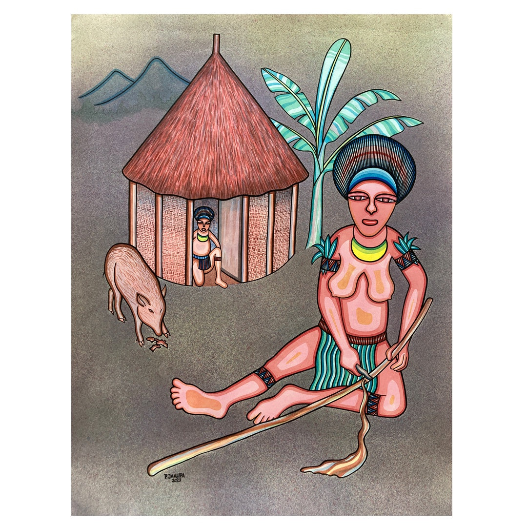 PAX JAKUPA | 'Removing Bark of Tree (lady)' | 2023 | Ink on paper | 73.5 (h) x 56 (w) cm
