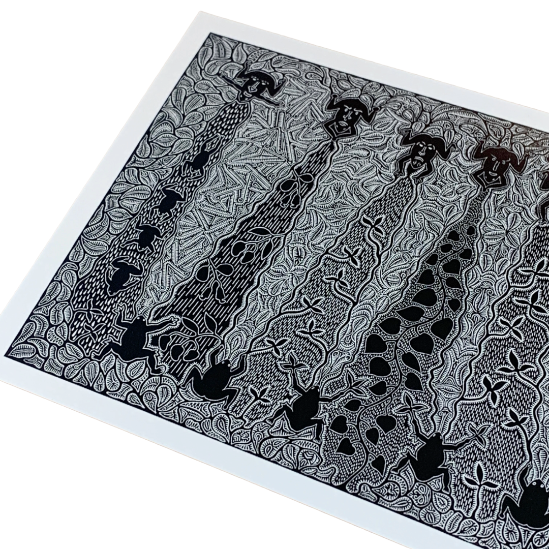 Story: "In our culture, rain signifies certain timeframes of seasonal change. All the rains have different names: Ubarau Peoythurathai Ari (Wongai rain, light rain), Malgui Ari (planting rain, bigger rain) and Laga Sizarai Ari (the first monsoon, big rain). In this work the frogs call up to the rain gods/spirits, who provide the rain as part of the cycle of nature. The work teaches further generations to respect cultural protocol, and that if you ask for what you need, you will receive. The rains also mark the beginning of a new cycle." - Billy Missi